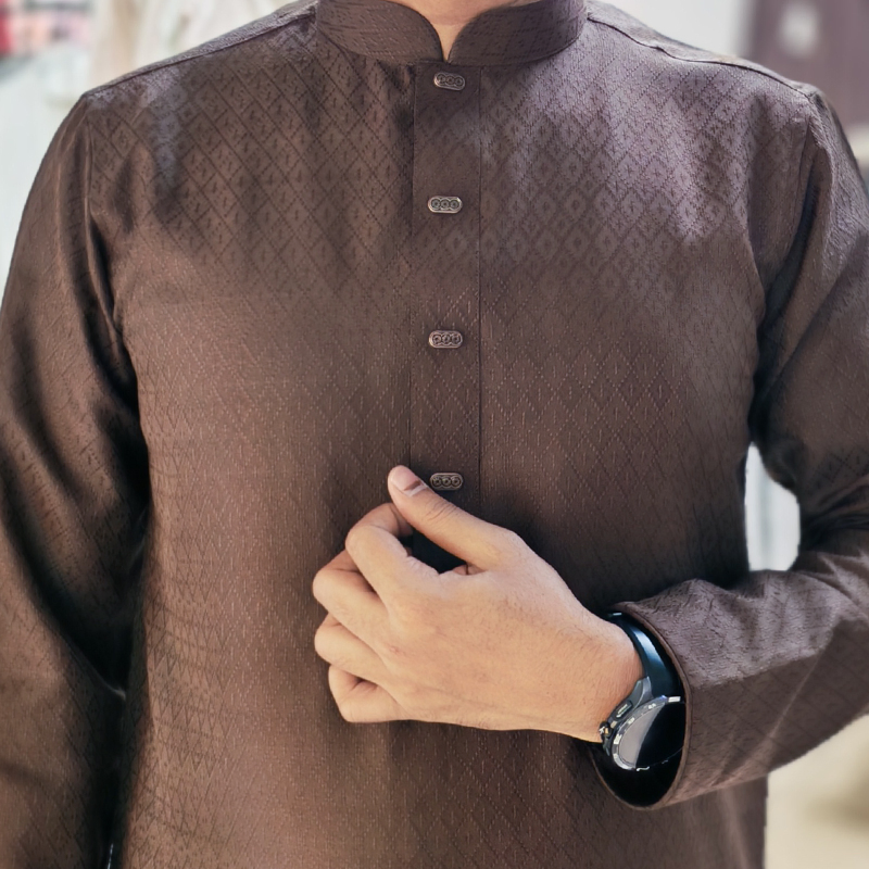 Refined in design and crafted with attention to detail, the coffee brown Solid Panjabi brings together classic elegance and everyday comfort. Made from premium blended jacquard fabric, it offers a smooth texture with durability, ensuring a comfortable experience throughout the day.
