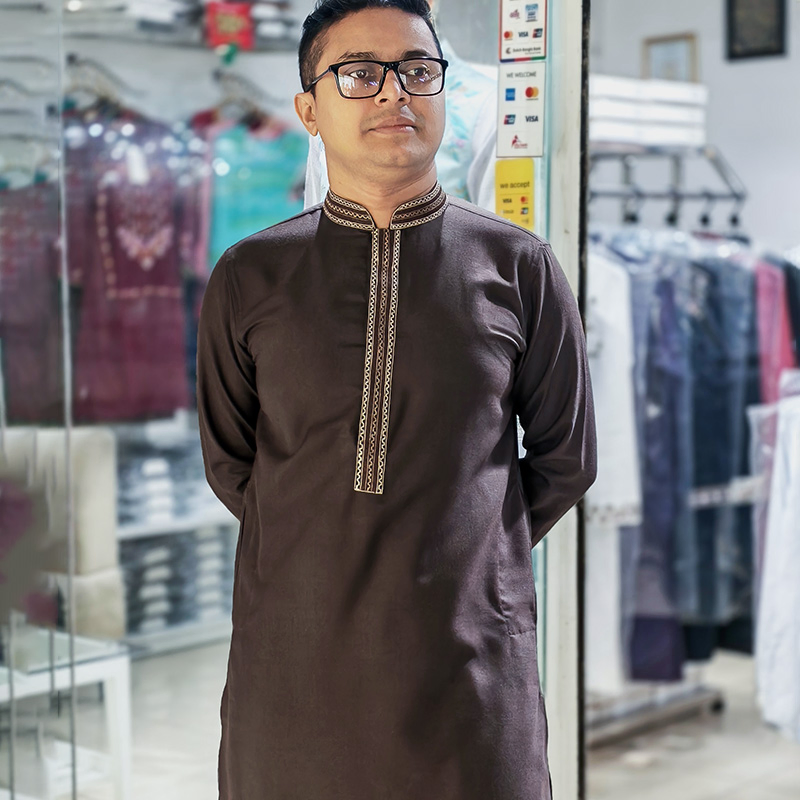 A refined blend of timeless tradition and modern comfort, this elegant panjabi is made with premium Viscose Cotton for a breathable, soft, and luxurious feel. The standout feature is the intricate embroidered work delicately adorning the placket, cuffs and collar, adding a touch of luxurious craftsmanship. Designed for those who appreciate the finer things in life, it offers an effortlessly stylish look—perfect for any occasion where grace meets ease.