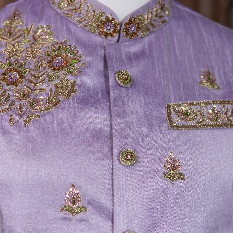 Discover our high-end Lavender Waist Coat with a premium zardozi work.Tailored to perfection with our HD Signature Cut, it features a round collar adorned with a round zardozi bottom, exuding timeless style. It is specially designed for grand events and occasions. With its meticulous zardozi work and superior craftsmanship, it radiates an aura of elegance and luxury, making it the perfect choice for those seeking a distinguished look on their memorable occasions.